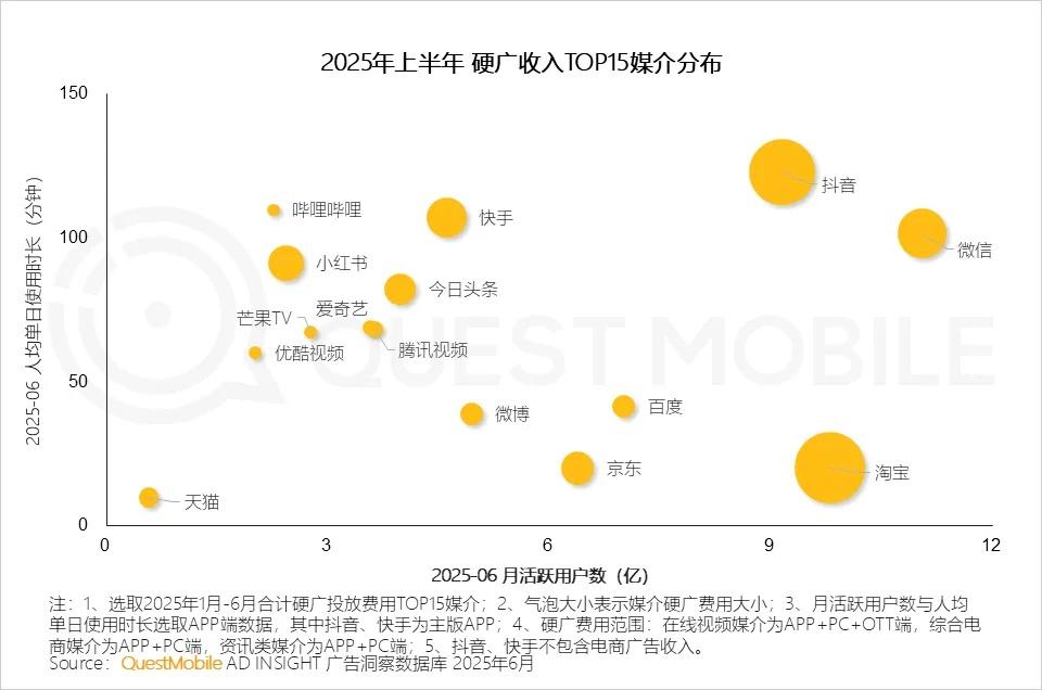 据QuestMobile数据,2025年上半年,互联网硬广收入排行里,百度远远落后其他媒介平台。