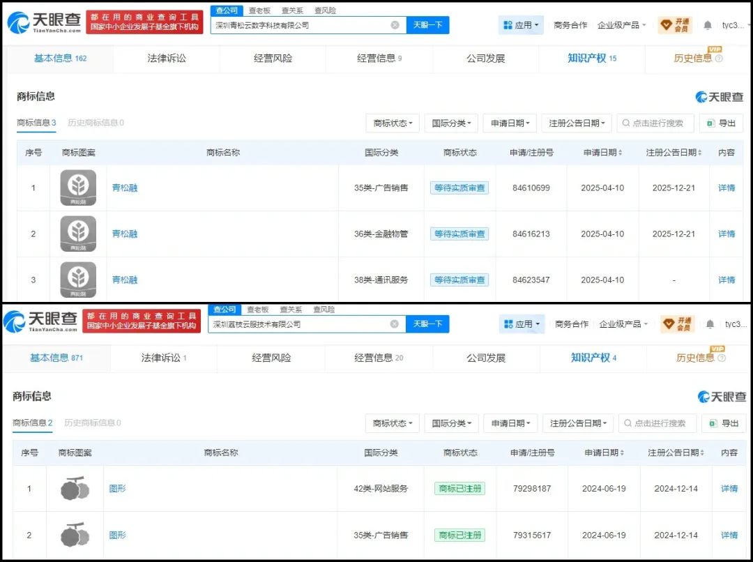 青松融的运营主体是深圳青松云数字科技有限公司(以下简称“青松云数科”),荔枝云服的运营主体是深圳荔枝云服技术有限公司。