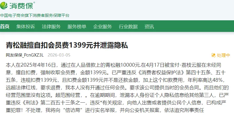 3月5日,消费保平台用户投诉称,其于2025年4月16日,通过人品借款在青松融借款1万元,次日(2025年4月17日),便被宝付-荔枝云服在未经同意的情况下,擅自扣取1399元会员费。该用户核算后,发现加上会员费,这笔贷款的年利率高达48%。