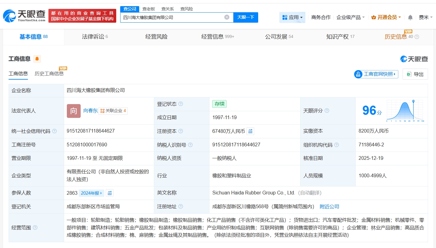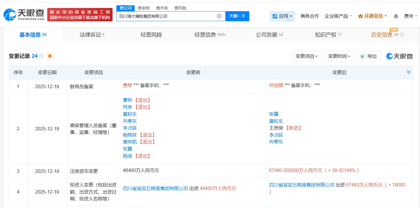 天眼查App显示,近日,四川海大橡胶集团有限公司发生工商变更,注册资本由4.84亿人民币增至约6.75亿人民币,增幅约39%,同时,多位高管发生变更。