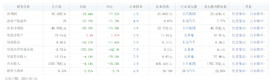 据证券之星整理资料,上汽一季度报告众有3个指标值得关注,净利润44.16亿元同比下降19.44%,环比下降77.52%却排名行业第一,行业平均值仅有17.06亿元;扣非净利润49.53亿元同比下降20.36%,环比下降73.34%却排名行业第一,行业平均值仅有12.72亿元;营业收入1,767.76亿元,同比下降4.14%,环比下降76.74%却排名行业第一,行业平均值仅有428.14亿元。