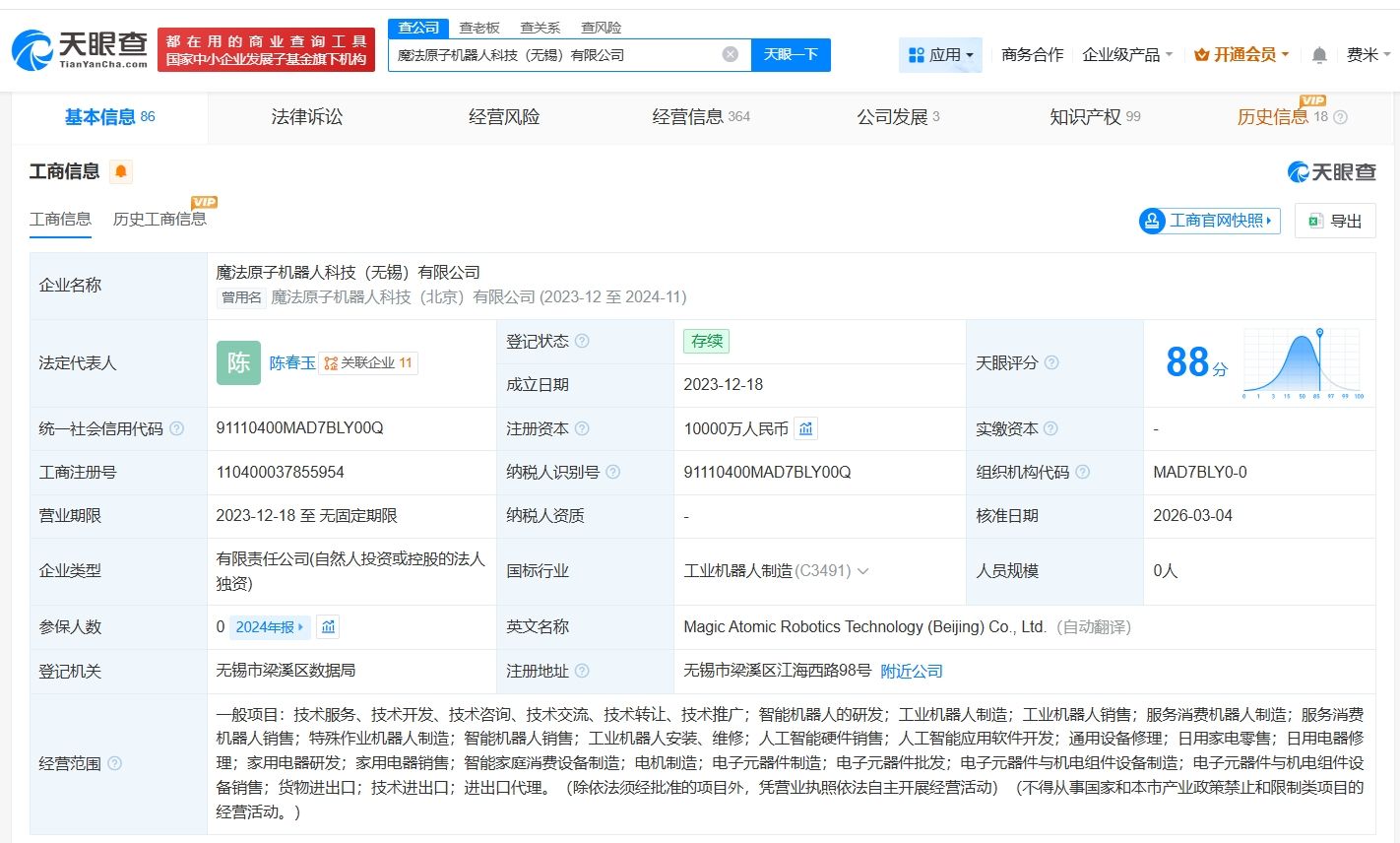 该公司成立于2023年12月,法定代表人为陈春玉,注册资本1亿人民币,经营范围包括智能机器人的研发、工业机器人制造、服务消费机器人制造等,由魔法工场(无锡)科技有限公司全资持股。