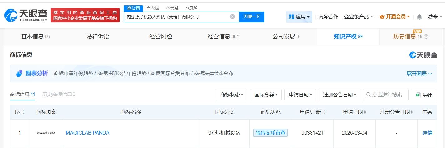 天眼查知识产权信息显示,近日,魔法原子机器人科技(无锡)有限公司申请注册“MAGICLAB PANDA”商标,国际分类为机械设备,当前商标状态为等待实质审查。