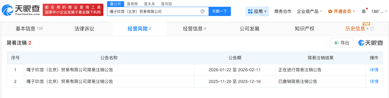 天眼查经营风险信息显示,近日,嘎子玖馆(北京)贸易有限公司新增一则简易注销公告,公告期为2026年1月22日至2026年2月11日。