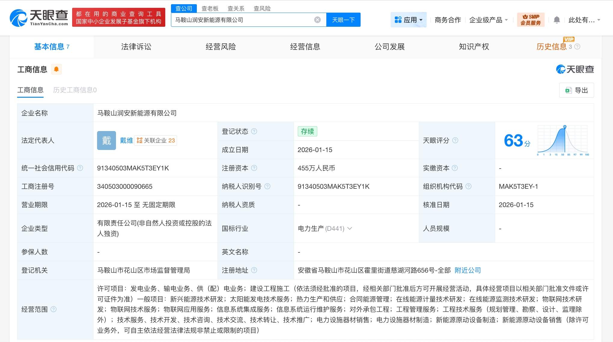 天眼查工商信息显示,近日,马鞍山润安新能源有限公司成立,法定代表人为戴维,注册资本455万人民币,经营范围含发电业务、输电业务、供(配)电业务,建设工程施工,新兴能源技术研发,太阳能发电技术服务,热力生产和供应,合同能源管理,在线能源计量技术研发,在线能源监测技术研发等。