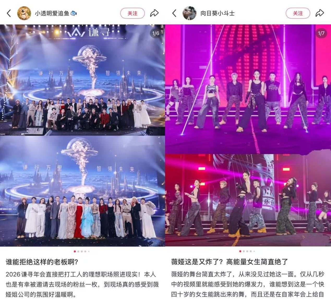 最先刷到的是谦寻最近开年会,很多薇娅的粉丝,和谦寻合作的商家都被邀请到了现场。不少关注薇娅多年的老粉第一次线下看到了真人,纷纷激动地发帖记录。印象中,谦寻一直非常重视年会这种仪式感很强的活动,去年的年会上,薇娅本人还上台跳舞了。