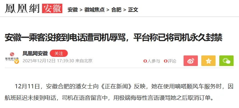 2025年12月12日报道的合肥事件里,关键不是取消本身,而是语音留言里的侮辱性言语与平台对罚款权限的缺失。顺风车与网约车不同,交易并非标准化运力,更多依赖双方克制与信任,一旦言语越界,乘客的安全感可能会坍塌,车主也会用“取消”切断接触,平台能做的往往只剩封禁与拉黑选项。
