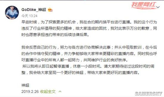 2月20日,斗鱼宣布将起诉旗下主播、《英雄联盟》前职业选手神超,因其单方面违约跳槽。今日,神超在自己微博上对此事进行了回应并致歉,称自己违反了行业所倡导的契约精神,愿意承担违约带来的后续法律后果,会反思自己的行为,并将从即日起暂停直播,休息一小段时间。
