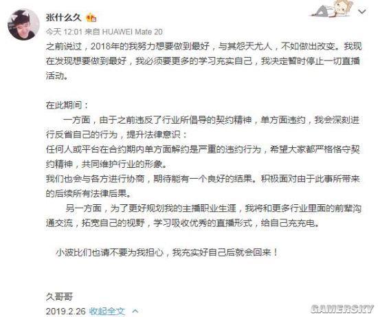 今天早些时候,另外一位从斗鱼跳槽到虎牙的主播久哥也发布了公告,内容和神超的差不多,也是表示将反思,暂停直播一段时间。