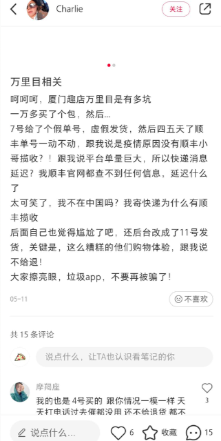 同时,除了售假方面的投诉之外,在小红书等平台上,也可以看到关于万里目服务上的相关吐槽。其中一名用户吐槽称,一万多买了个包,然后7号给了个假单号,虚假发货,四五天了顺丰单号一动不动。之后,万里目方面解释称是疫情原因没有顺丰小哥揽收,平台单量巨大,所以快递消息延迟。但是,该用户表示,自己顺丰官网都查不到任何信息,还不给退货。
