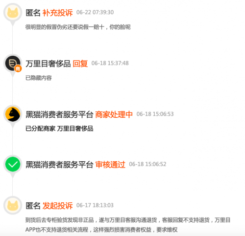 据黑猫投诉网站上公布的数据显示,关于万里目的投诉数量已经超400个,除了售假相关的投诉之外,还包括发货以及售后服务上的投诉。一名消费者投诉称,自己在万里目上购买的商品到货后去专柜验货发现非正品,遂与万里目客服沟通退货,客服回复不支持退货,万里目APP也不支持退货相关流程。