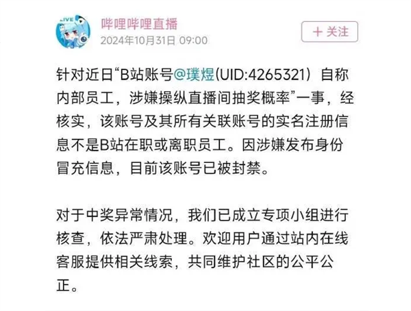针对“疑似内部员工操纵中奖”一事,哔哩哔哩直播官方发布声明称:针对近日“B站账号@璞煜(UID:4265321)自称内部员工,涉嫌操纵直播间抽奖概率”一事,经核实,该账号及其所有关联账号的实名注册信息不是B站在职或离职员工。因涉嫌发布身份冒充信息,目前该账号已被封禁。