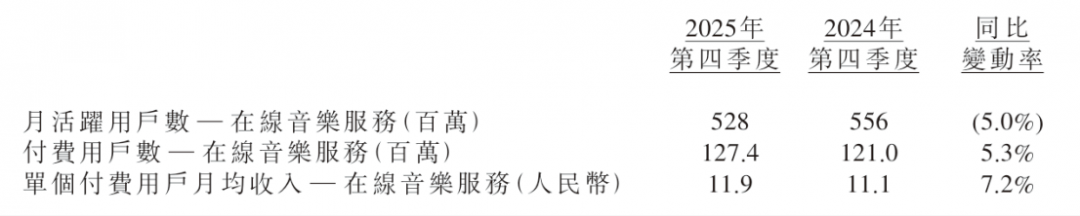 陆玖商业评论注意到,更耐人寻味的是,2026年开始,腾讯音乐将不再披露在线音乐MAU、付费用户数和ARPPU季度数据。
