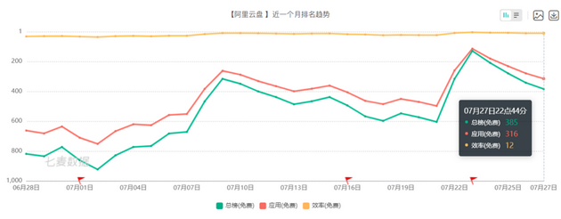 据七麦数据显示,最热的时候,阿里云盘在App Store总榜排名位居第2名。随后排名一路下滑。据最新数据,截至目前,其在App Store总榜排名已跌落至总榜385名左右。期间,在5月末时还曾一度跌至总榜1000名外。