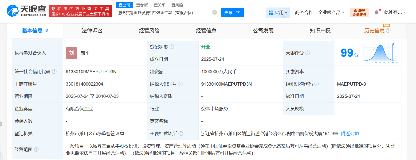 天眼查App显示,近日,服务贸易创新发展引导基金二期(有限合伙)成立,执行事务合伙人为刘平,出资额100亿人民币,经营范围为以私募基金从事股权投资、投资管理、资产管理等活动。合伙人信息显示,该基金由中华人民共和国财政部、招商局资本管理(北京)有限公司、杭州产业投资有限公司、杭州市钱江合晟控股发展有限公司等共同出资。