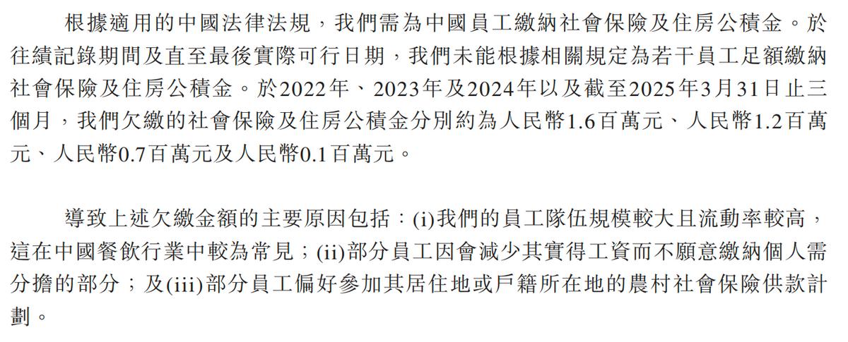 另一方面,根据招股书,巴奴2022年、2023年、2024年及2025年前3个月,公司欠缴的社会保险及住房公积金分别约为160万元、120万元、70万元及10万元。