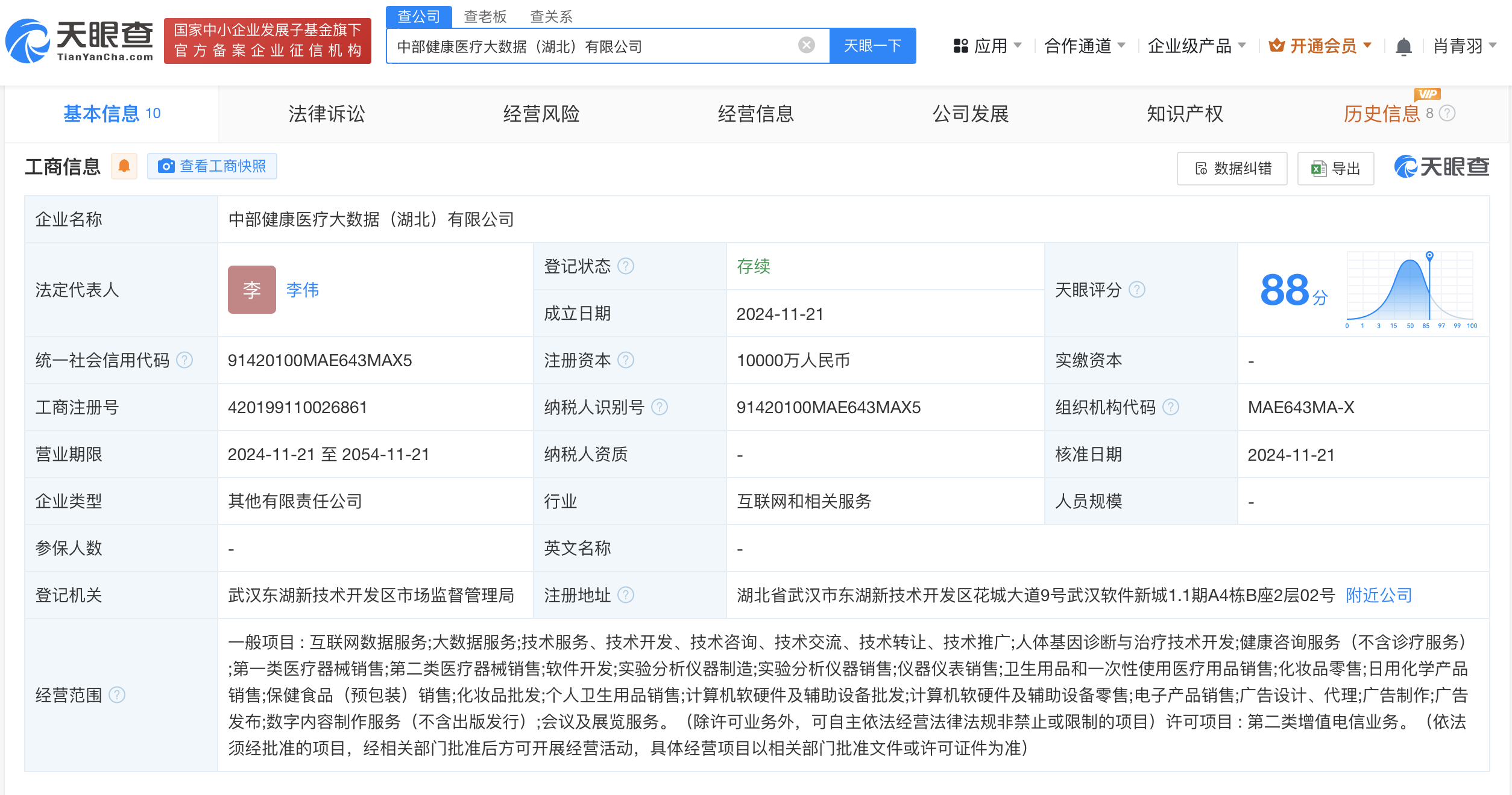 天眼查App显示,近日,中部健康医疗大数据(湖北)有限公司成立,法定代表人为李伟,注册资本1亿人民币,经营范围含互联网数据服务、大数据服务、人体基因诊断与治疗技术开发、健康咨询服务、第一类医疗器械销售、第二类医疗器械销售等。股东信息显示,该公司由国新健康(000503)、湖北数据集团有限公司共同持股。