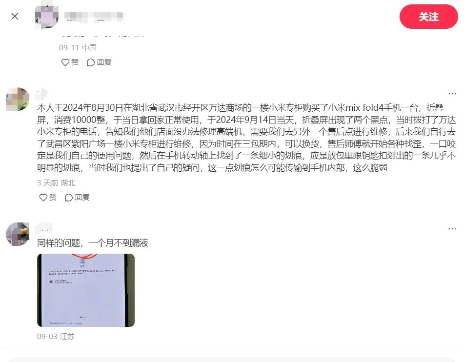 来自北京、广州、西安、云南等地,同样遇到漏液问题的多位小米折叠屏手机用户向元新闻反映,他们手机出现故障的时间,最快不到购买后一个月,最久也只有近半年。而遇到售后问题后,一年质保服务往往因为“人为损坏”这一理由而拒绝,他们不得不自己为高价维修买单。