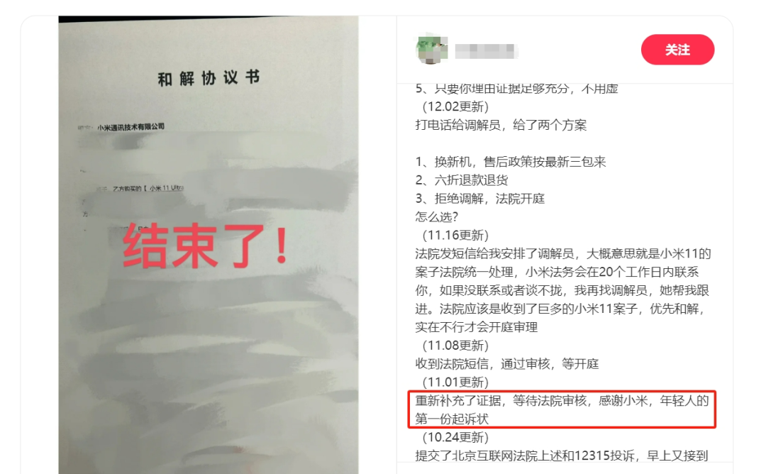 还有一位因小米11 ultra手机Wi-Fi模块失灵,要求换新或退款遭拒后,通过拨打12345,提交诉状等方式,历经两个月终于维权成功的小红书用户在帖子中表示“感谢小米,年轻人的第一份起诉状。”