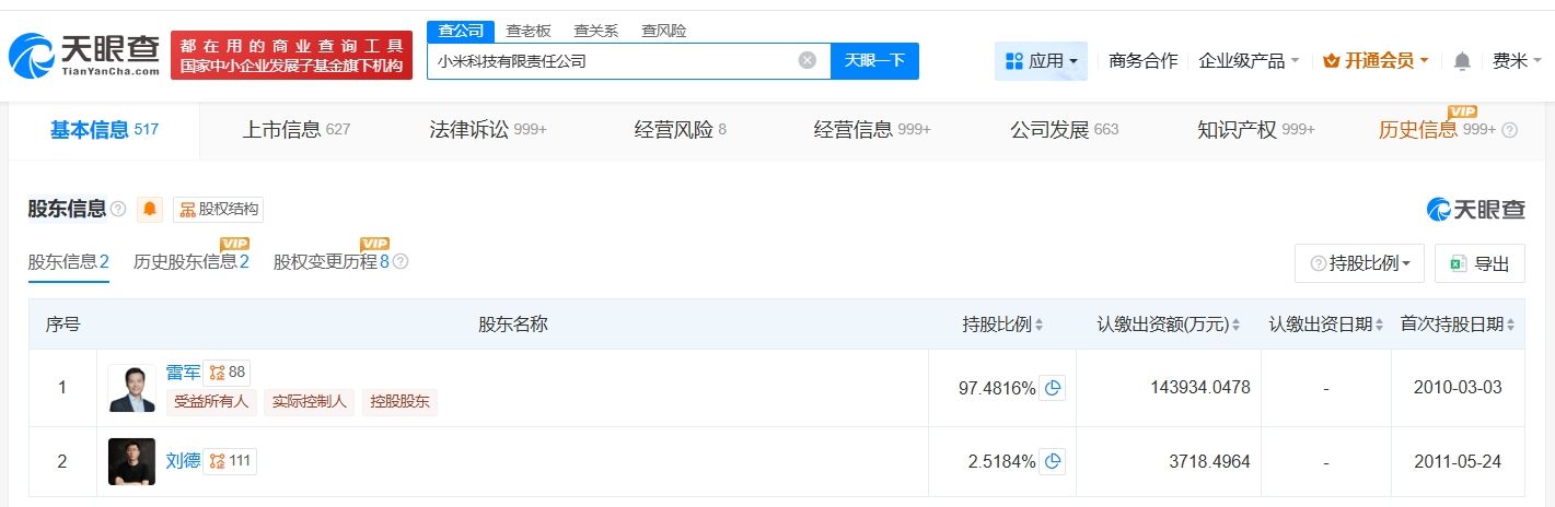 小米科技有限责任公司成立于2010年3月,法定代表人为雷军,注册资本约14.8亿人民币,经营范围包括通讯设备销售、厨具卫具及日用杂品批发、厨具卫具及日用杂品零售等,由雷军、刘德共同持股。