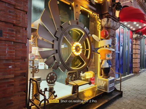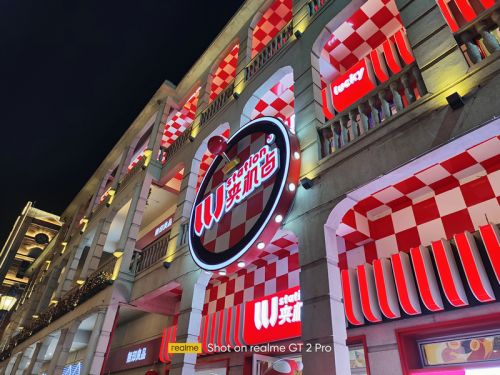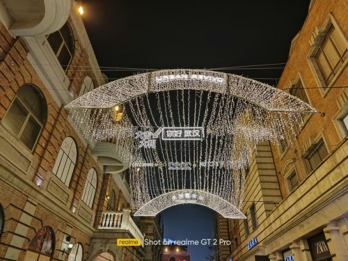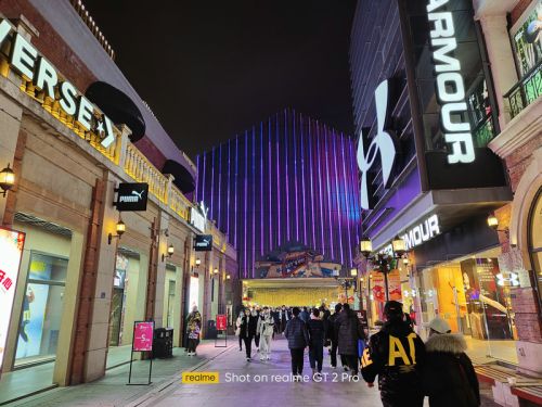 在夜晚的拍照场景中,真我GT2 Pro在拍摄中可以保持对于复杂光线良好的控制力,还能进一步压低曝光时间和感光度来保证画面的纯净度,画面通透亮度较高,同时噪点控制得不错,明亮多彩的灯光也没有严重的过曝和失真,给人的第一观感不错。同时得益于索尼IMX766传感器和全新⾃研 ProLight 超感光技术的加持,即使在极暗的场景下,该机也能拍出明亮、纯净的夜景照⽚。