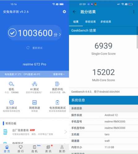 从结果来看,真我GT2 Pro的安兔兔跑分为1003600分,GeekBench4的单核得分6939,多核得分15202,均是当前安卓阵营妥妥的顶级水准。