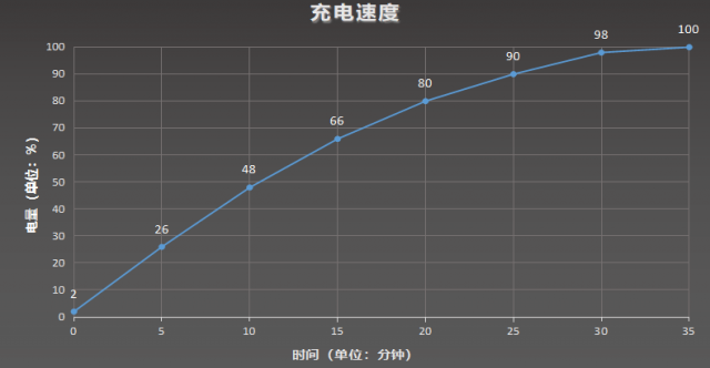 在实际充电测试中,该机5分钟便可充入26%,10分钟可充满48%,完全充满也仅需33分钟,这一充电速度可以让你在任何空余的时间轻松将电池充满。