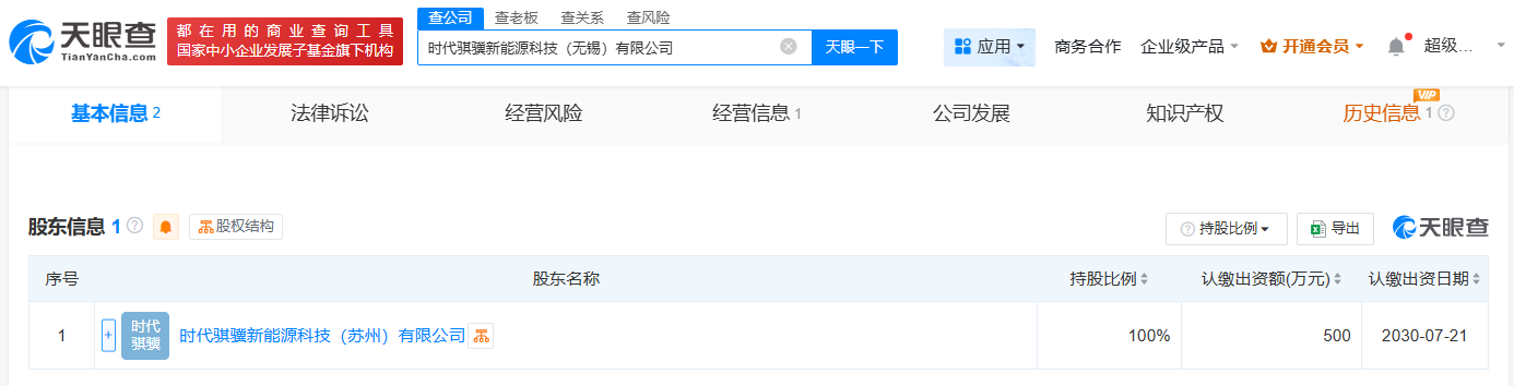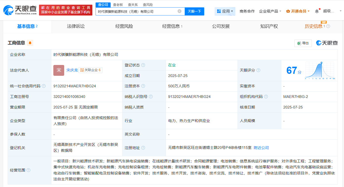 天眼查App显示,近日,时代骐骥新能源科技(无锡)有限公司成立,法定代表人为宋庆龙,注册资本500万人民币,经营范围包括新兴能源技术研发、新能源汽车换电设施销售、在线能源计量技术研发等。