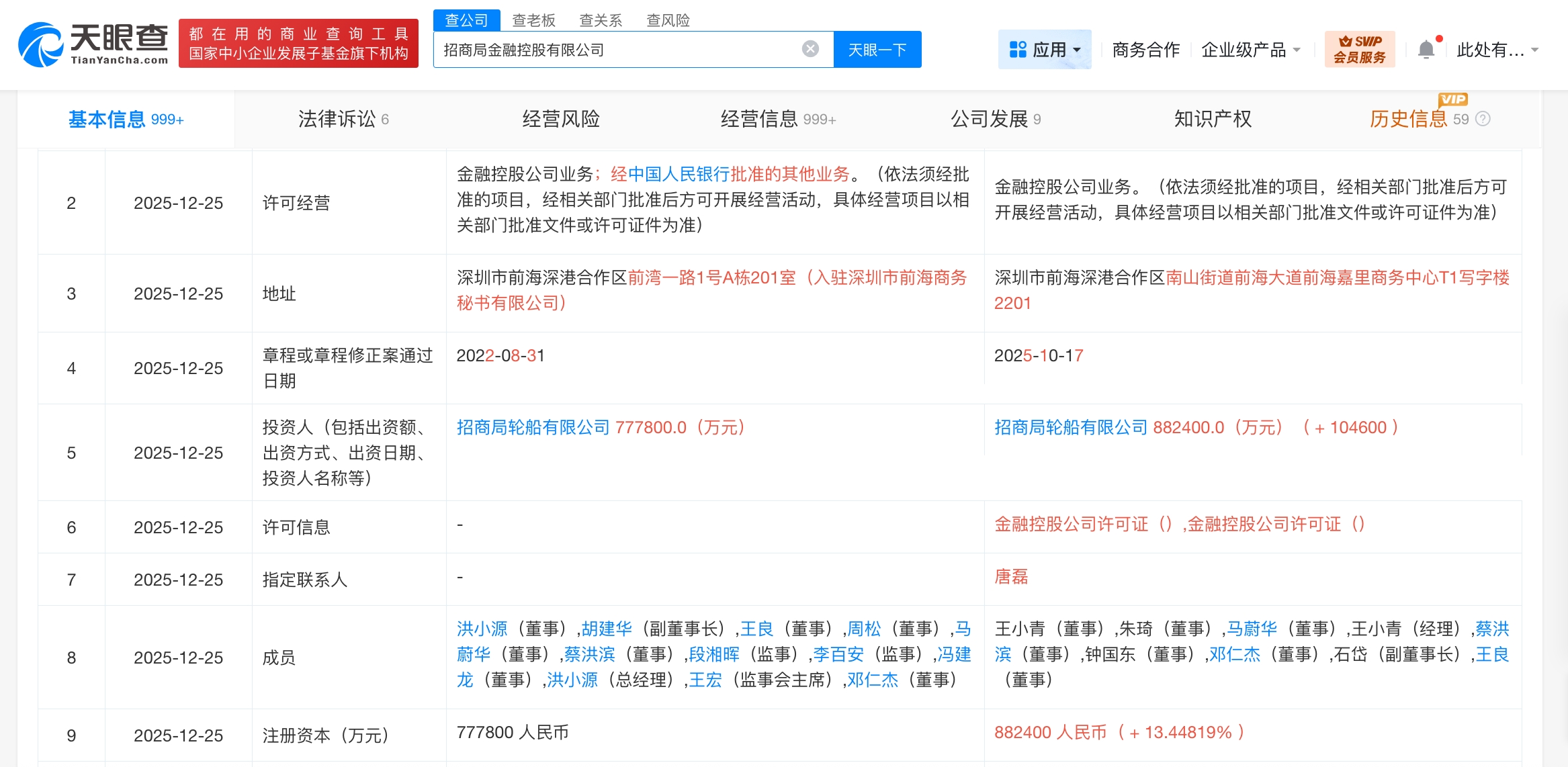 天眼查工商信息显示,近日,招商局金融控股有限公司发生工商变更,注册资本由77.78亿人民币增至88.24亿人民币,增幅约13%。