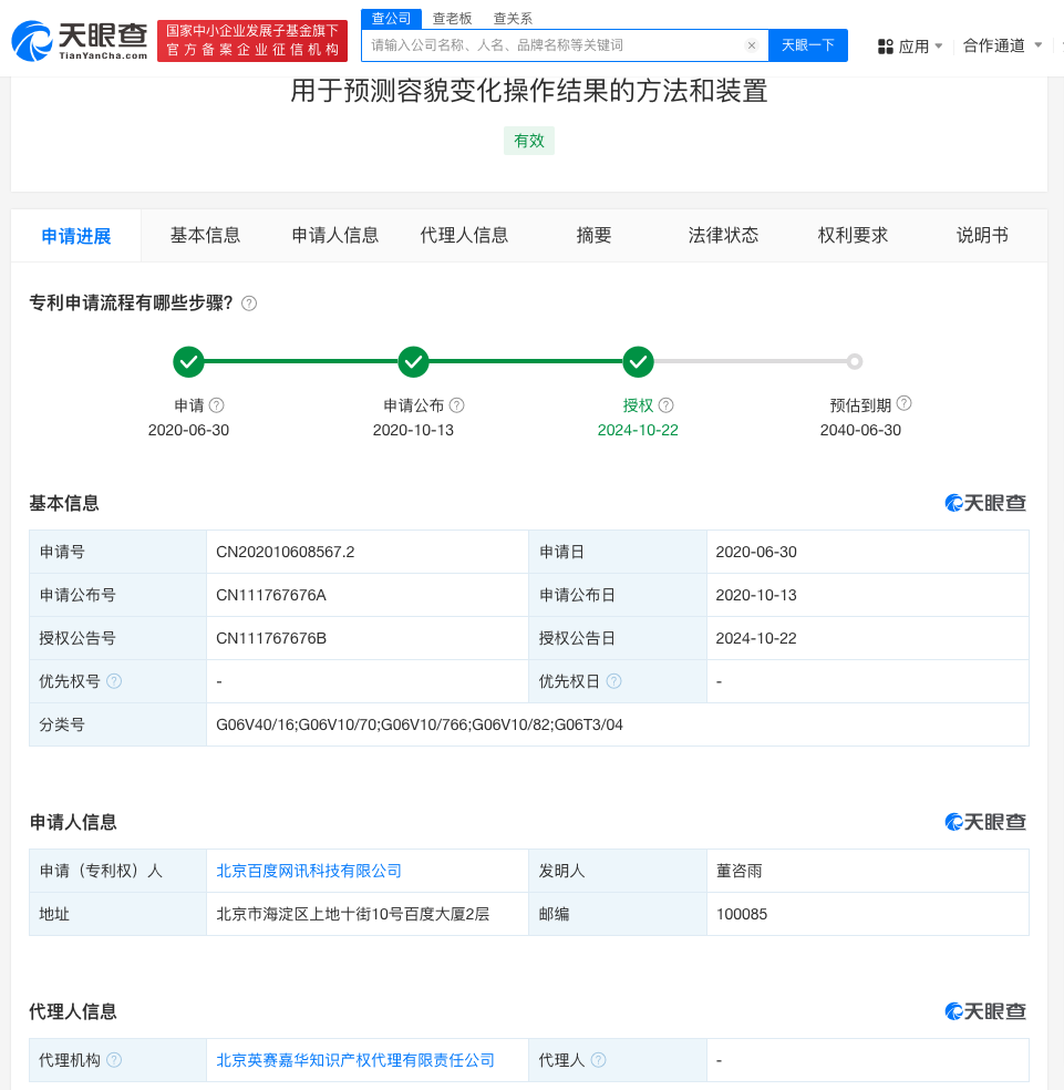 天眼查知识产权信息显示,10月22日,北京百度网讯科技有限公司申请的“用于预测容貌变化操作结果的方法和装置”专利获授权。