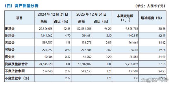 至2024年底,亿联银行的不良贷款余额已经达到了6.74亿元,不良贷款率高达2.77%,较2023年底的1.61%上升了1.16个百分点,不良率激增了72%!