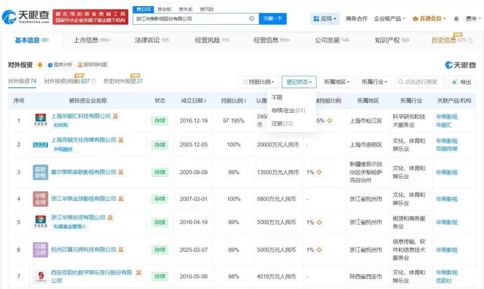 华策影视旗下20余家企业已注销 华策影视对外投资超70家企业观点