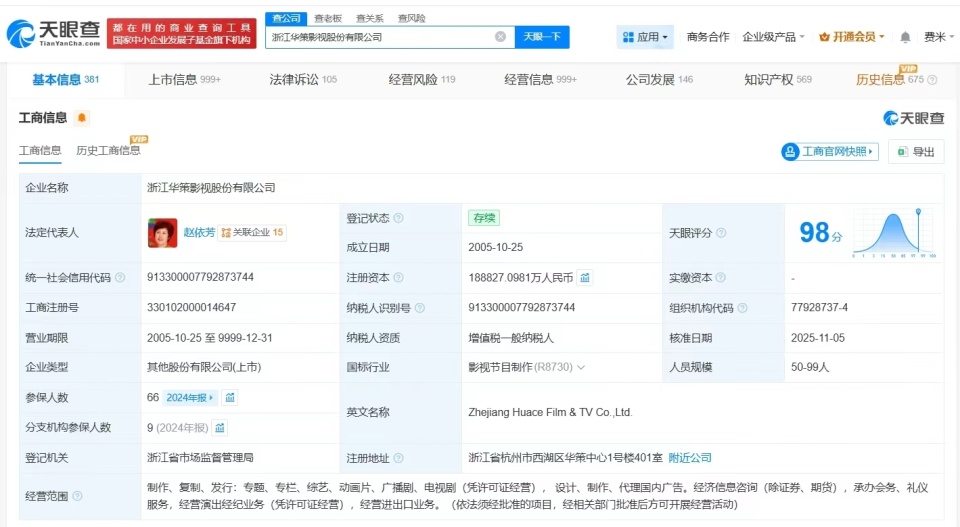 天眼查App显示,浙江华策影视股份有限公司成立于2005年10月,法定代表人为赵依芳,注册资本约18.9亿人民币,经营范围包括经济信息咨询、经营演出经纪业务、经营进出口业务等,由杭州大策投资有限公司、傅梅城、北京鼎鹿中原科技有限公司等共同持股。对外投资信息显示,该公司对外投资70余家企业,其中50余家企业处于存续状态,包括上海华剧汇科技有限公司、上海克顿文化传媒有限公司等,其他20余家企业已注销。