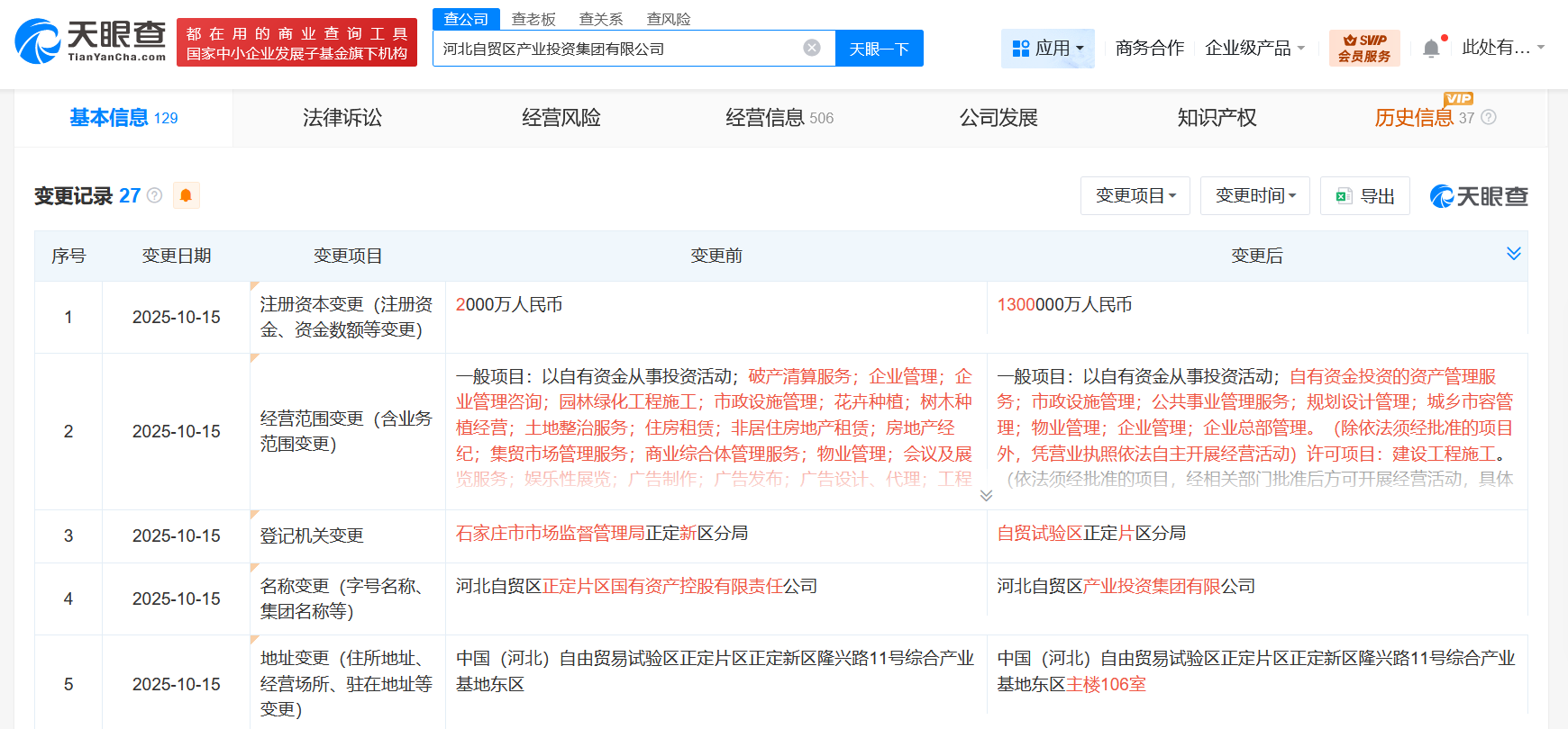 天眼查App显示,10月15日,河北自贸区正定片区国有资产控股有限责任公司发生工商变更,企业名称变更为河北自贸区产业投资集团有限公司,同时,注册资本由2000万人民币增至130亿人民币,增幅64900%。