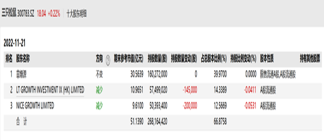 除了重仓良品铺子,今日资本旗下的“LT GROWTH INVESTMENT IX (HK) LIMITED”还是另一家休闲食品巨头三只松鼠的第二大股东。截至11月21日,其持有三只松鼠0.57亿的股份,占公司总股本的约14.34%。
