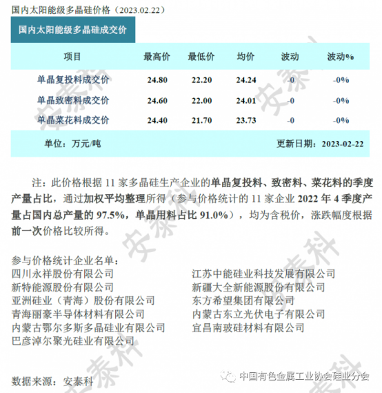 中国有色金属工业协会硅业分会数据显示,本周国内单晶复投料价格区间在22.2-24.8万元/吨,成交均价为24.24万元/吨,周环比维持不变;单晶致密料价格区间在22.0-24.6万元/吨,成交均价为24.01万元/吨,周环比维持不变。