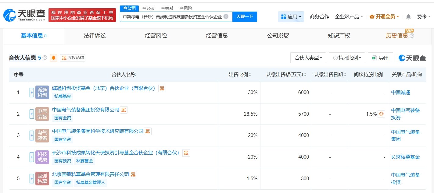 天眼查App显示,近日,中新绿电(长沙)高端制造科技创新投资基金合伙企业(有限合伙)成立,执行事务合伙人为北京国弧私募基金管理有限责任公司,出资额2亿人民币,经营范围为以私募基金从事股权投资、投资管理、资产管理等活动,创业投资。合伙人信息显示,该基金由诚通科创投资基金(北京)合伙企业(有限合伙)、中国电气装备集团投资有限公司、中国电气装备集团科学技术研究院有限公司、长沙市科技成果转化天使投资引导基金合伙企业(有限合伙)、北京国弧私募基金管理有限责任公司共同出资。