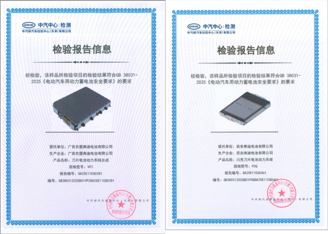 【TechWeb】5月28日消息,近日,比亚迪刀片电池和闪充刀片电池双双提前通过最新国标GB 38031-2025《电动汽车用动力蓄电池安全要求》全项检测,并获得中汽研汽车检测中心专业认证证书,提前满足新国标要求,构筑更坚实的技术优势。