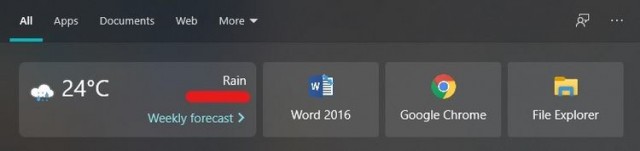 微软已删除了Search UI中列出的两个应用程序,以腾出空间来显示天气信息,该信息显示在左上角。