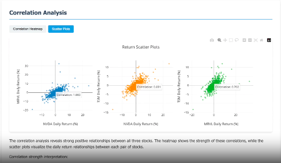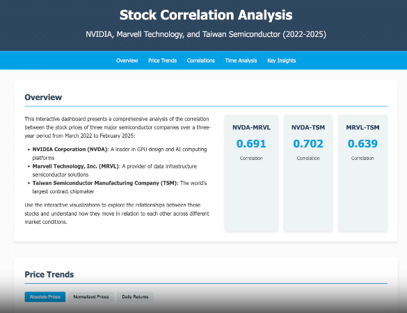 用户提出需求:分析过去三年英伟达、迈威尔科技和台积电股票价格之间的相关性。