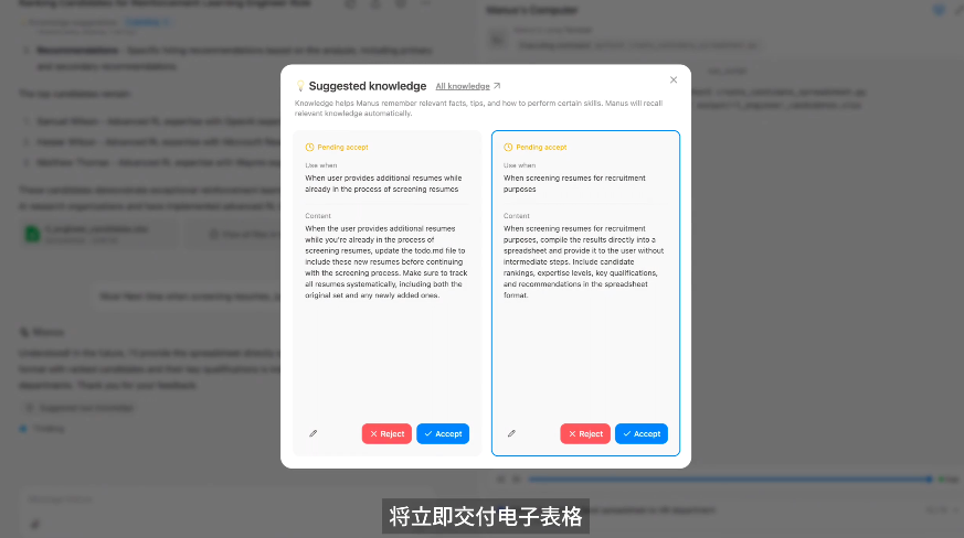 用户向Manus提交了10份简历的压缩文件,Manus会自动解压文件,然后浏览每份简历并记录重要信息。期间,用户又再次上传5份简历给Manus。在分析完所有15 份简历后,Manus 给出了排名建议,并提供了候选人资料和评估标准作为参考。最后,用户让 Manus 生成Excel表格,Manus能自动将这些内容通过编写代码来生成对应的表格。