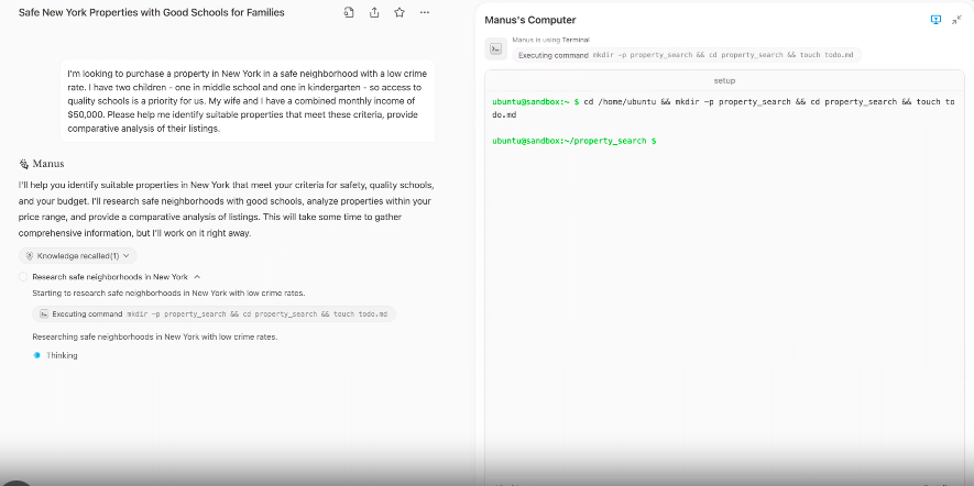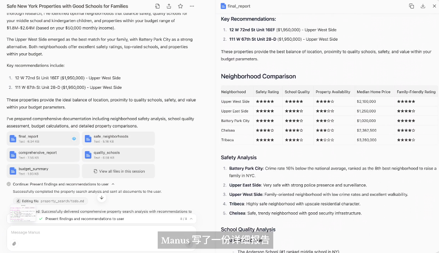 Manus将上述任务分解为多个步骤,创办了待办清单,包括阅读有关纽约最安全社区的文章,通过编写程序计算可负担的房产预算,然后在房地产网站上筛选房源。最后,Manus成功整合所有信息,并撰写出详细报告。