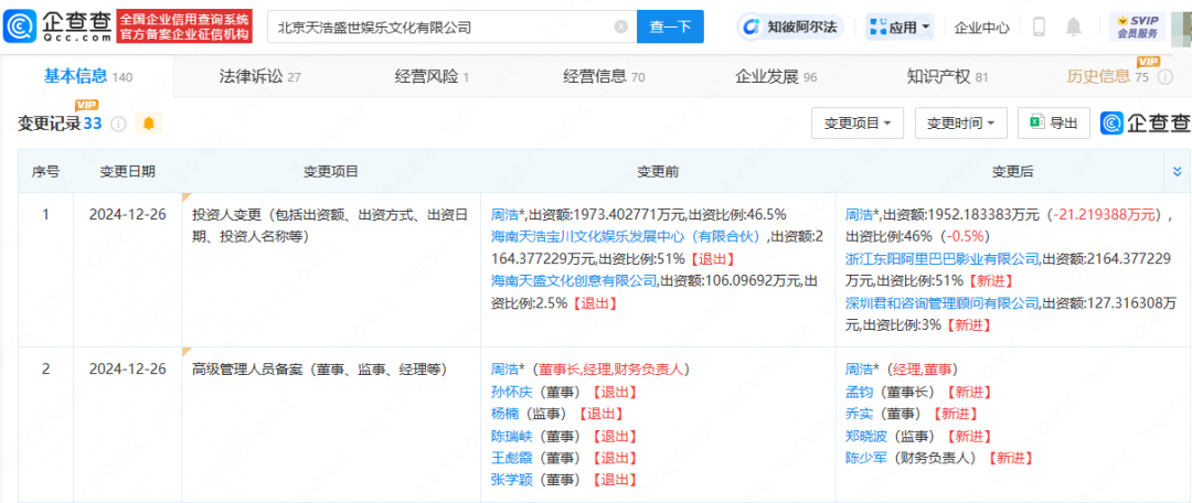【TechWeb】12月26日消息,企查查APP显示,近日,北京天浩盛世娱乐文化有限公司发生工商变更,原股东海南天浩宝川文化娱乐发展中心(有限合伙)、海南天盛文化创意有限公司退出,新增股东浙江东阳阿里巴巴影业有限公司、深圳君和咨询管理顾问有限公司。