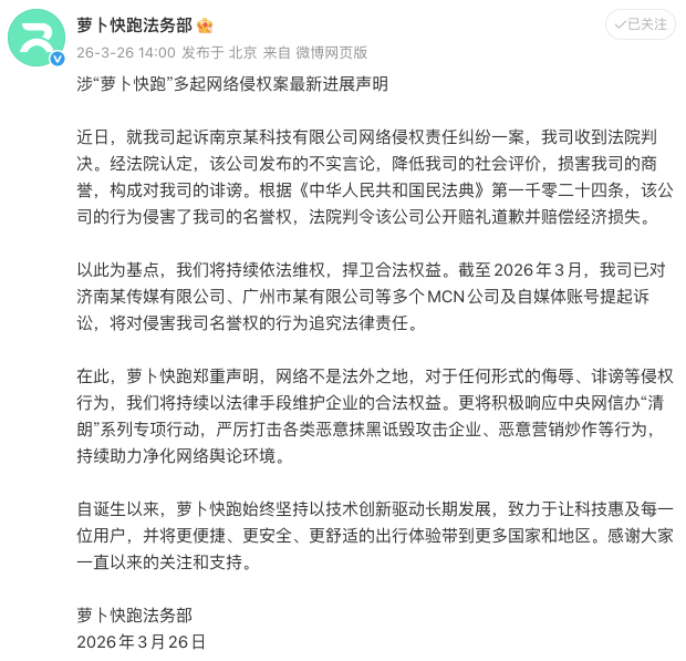 此外,萝卜快跑法务部官方账号发文透露,截至2026年3月,其已对多个MCN机构及自媒体账号提起诉讼,集中打击一批涉嫌恶意造谣、抹黑企业的网络账号。