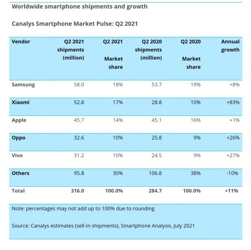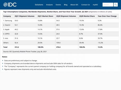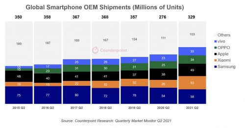 从四大知名机构提供的最新数据可知,2021年第二季度小米全球市场份额跃居世界第二,成功超越苹果,距三星仅一名之隔。
