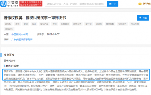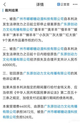 喜羊羊与灰太狼公司起诉侵权方获赔快报