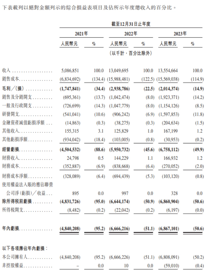 注意到,哪吒汽车母公司合众新能源今年 6 月 26 日向港交所递交 IPO 申请。招股书显示,2023 年哪吒汽车营收 135.55 亿元,净亏损 68.67 亿元。这家公司过去三年累计亏损 183.8 亿元,三年内的毛利率分别为-34.4%,-22.5%,-14.9%。