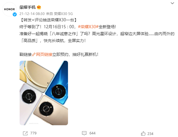 据悉,全新的荣耀X30将在12月16日的荣耀周年庆上正式发布,主打“快充长续航”,并且在充电速度、电池、续航、屏占比与边框控制方面都有着一定的提升,称得上是“充满诚意”。更多详细信息,我们拭目以待。
