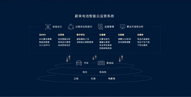 在解决电池寿命问题的运营方面,蔚来建设了电池智能云运营系统,包括云BMS、云回收、数字孪生、云健康、云配置、云服务等多个板块。
