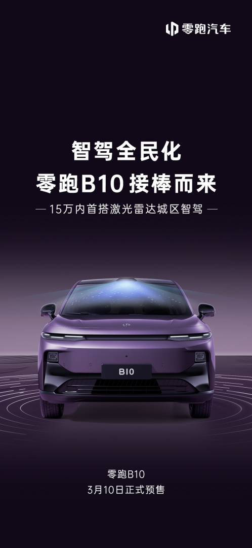零跑B10将于3月10日开启预售 15万内搭载激光雷达和城区智驾汽车